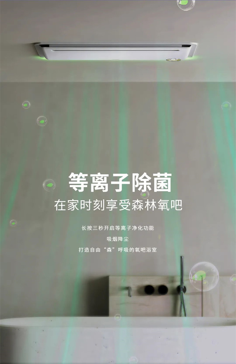“幻影一号”鲸吸瞬排换气,能够瞬间扫除异味;一键干燥除湿,烘干水汽,帮你远离发霉困扰;长按三秒开启等离子杀菌功能,清新空气,让你在家时刻享受森林氧吧。