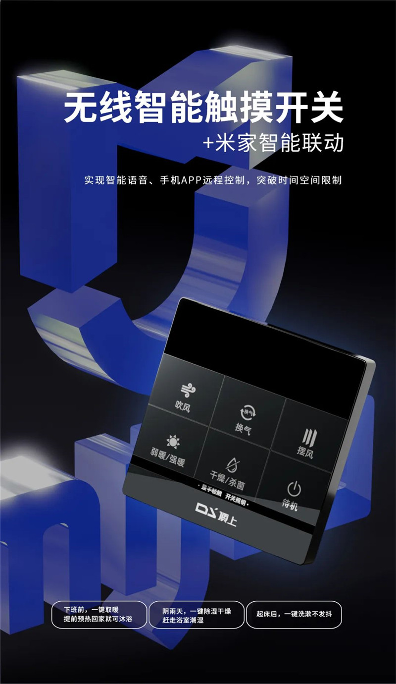 无线智能触摸开关+米家智能远程操控,语音呼唤,解放双手,操作更便捷;出门在外,通过手机APP一键预约开启取暖模式,实现多种智能生活场景的一体控制,同时还能随时监测设备的开启和关闭状态,突破时空限制,让生活充满从容与舒适。