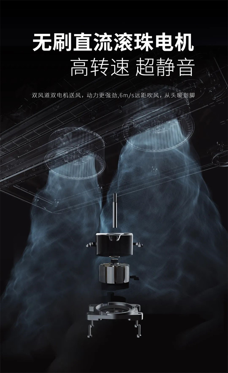 无刷直流滚珠电机,高转速、超静音,比普通交流电机节能1/3,同时采用两档取暖,满足不同季节与人群的取暖需要。