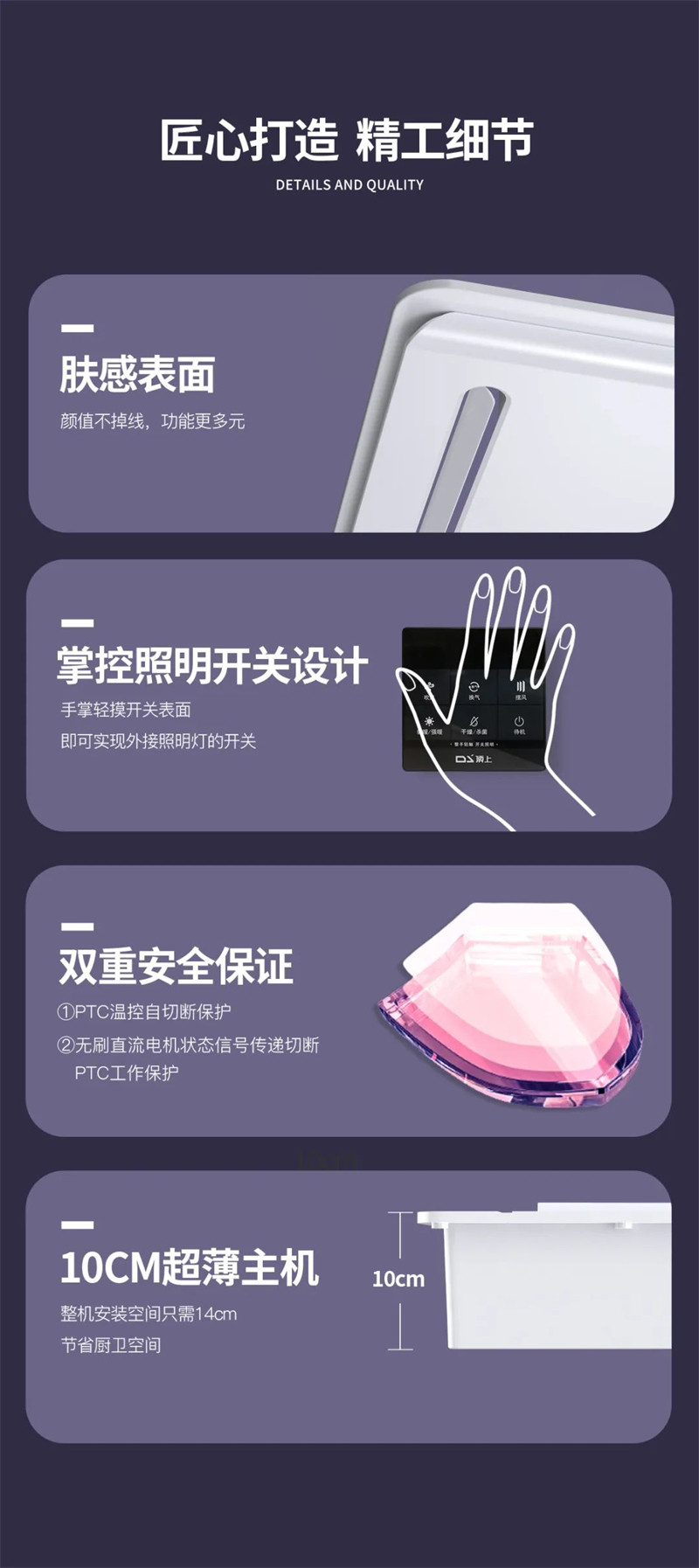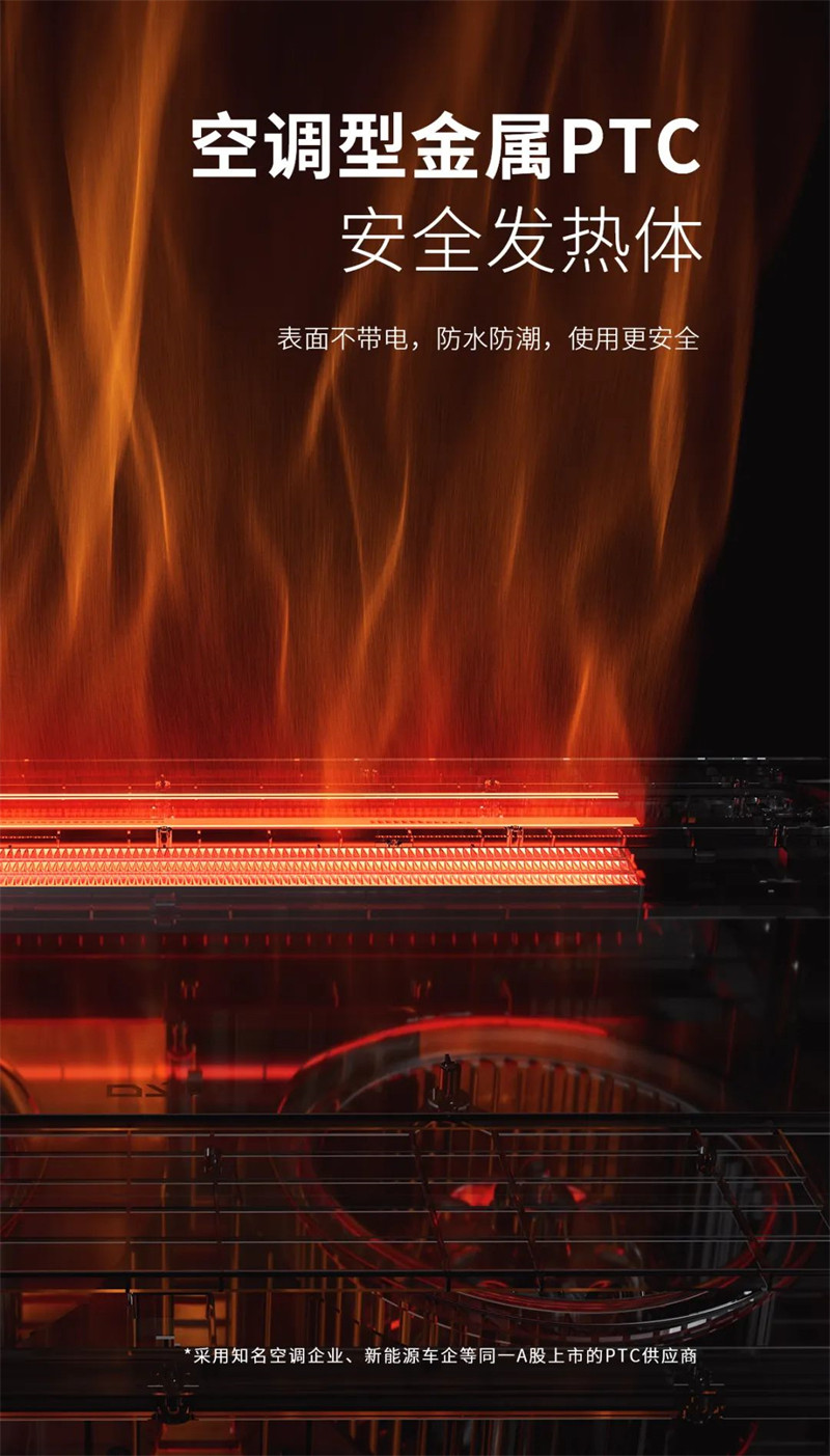 采用空调型金属PTC材质,安全发热体,表面不带电,防水防潮使用无忧,同时还设置了双重安全保障:①PTC温控自切断保护;②无刷直流电机状态信号传递切断PTC工作保护;贴心守护您和家人的安全。