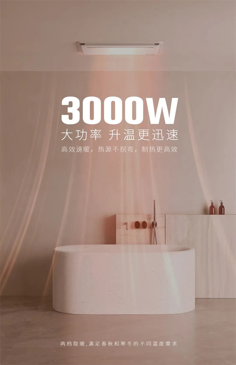 小身材,大能量,3000W大功率高效速暖,双风道双电机送风,动力更强劲,制热更迅速,让你在踏入浴室的那一刻瞬间温暖如春。