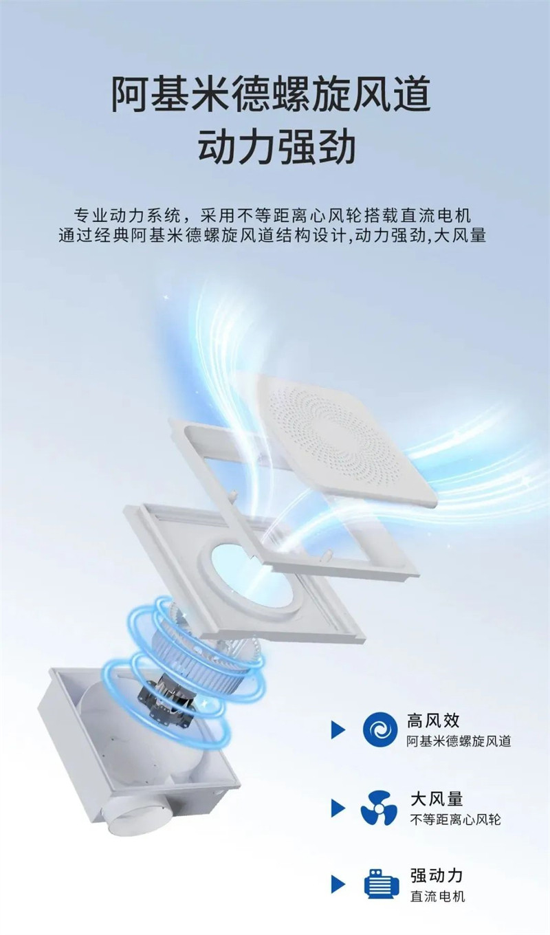 阿基米德螺旋风道结构设计,采用不等距离心风轮搭载直流电机,动力强劲,风量更大,快速排出室内异味,无论是油烟味、香烟味还是卫生间异味,通通快速净化,还你一室清新。