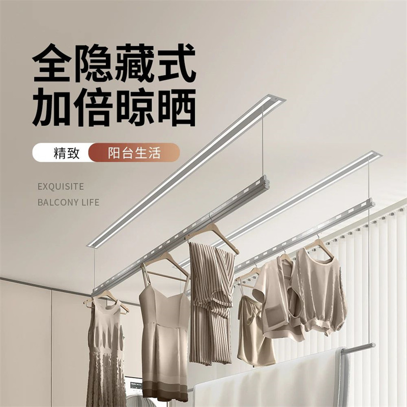 顶上隐形智能语音晾衣机来啦!全隐藏式加倍晾晒,分为单杆和双杆两种款式,打造阳台颜值天花板,满足你对智能家居+简约生活的美妙想象。