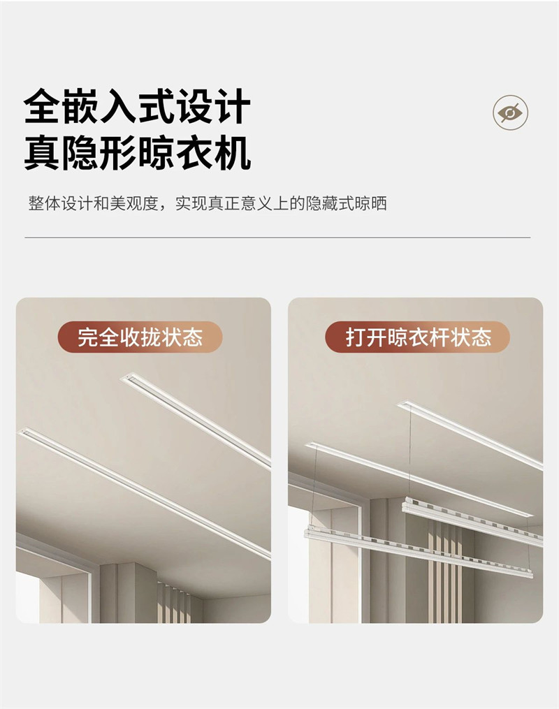 顶上隐形智能语音晾衣机采用嵌入式线性设计,外观简约轻盈充满格调,处于收拢状态时,能够完美隐藏于吊顶之中,平整美观不占空间,不遮视野,让你能够尽情享受阳台生活。