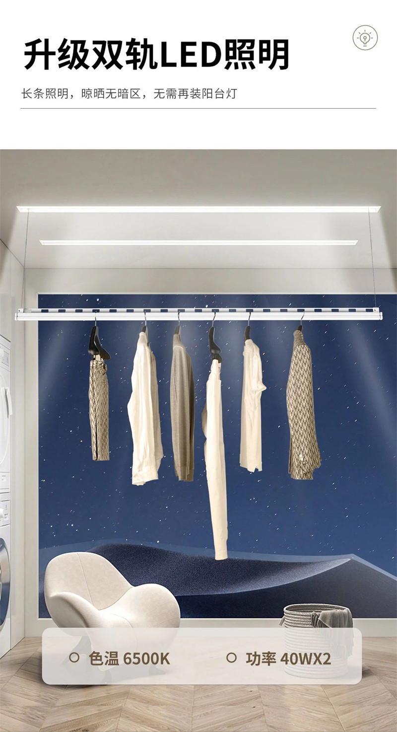同时这款晾衣机自带双轨LED照明,让夜晚晾衣取衣更加方便,还能节省购买和安装阳台灯的费用,晾晒无暗区,生活更惬意。
