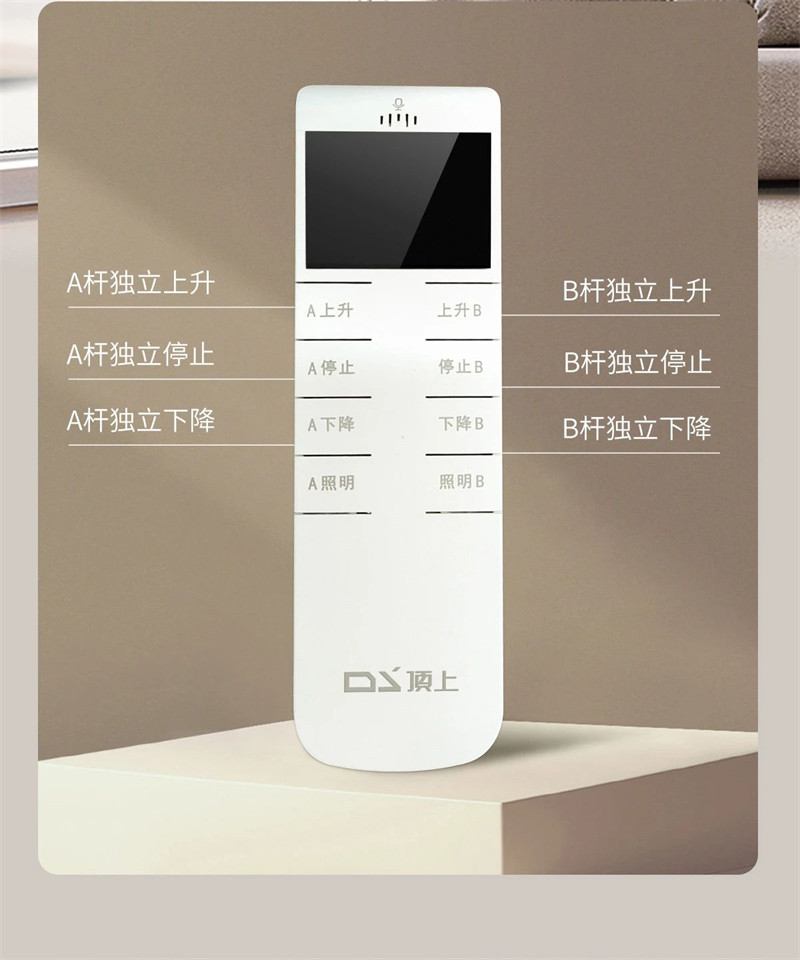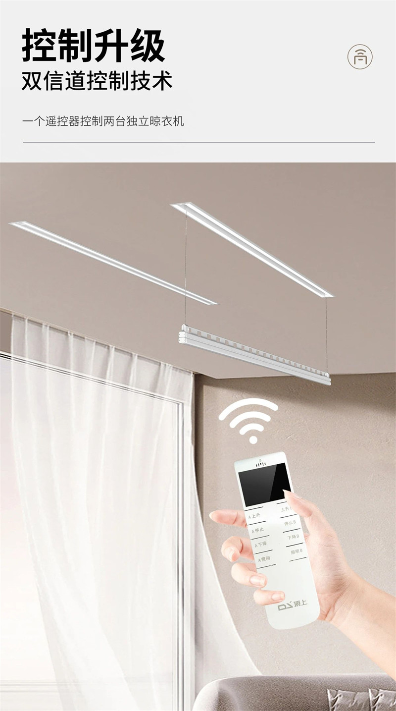如果你不习惯语音声控,这款晾衣机还配备了遥控器,一个遥控器控制两台独立晾衣机,让琐碎的晾衣过程更加便捷轻松。