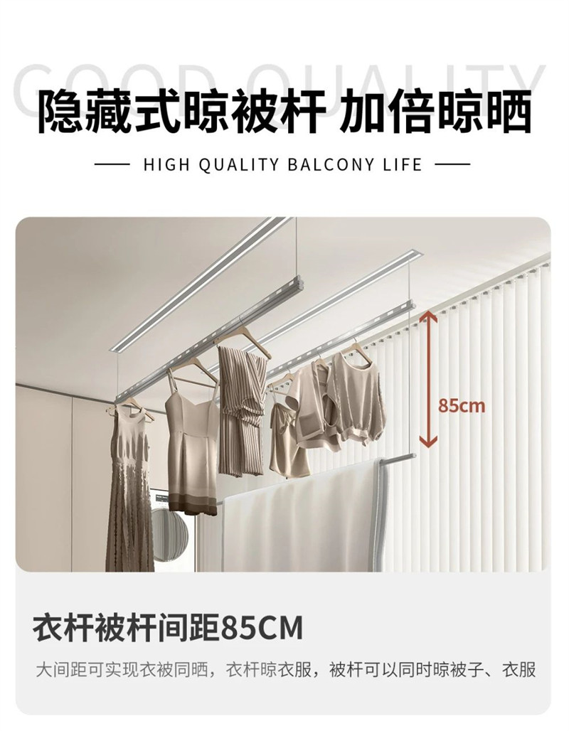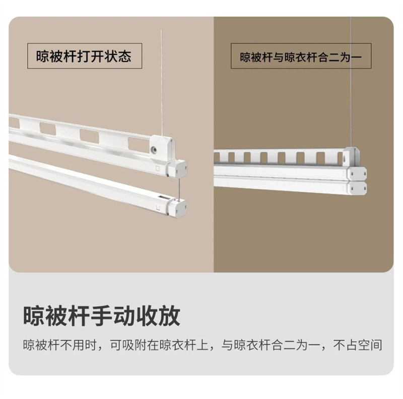 晾衣机,不止晾衣,还能晾被。晾被杆不用时,可以吸附在晾衣杆上,需要晒被子时,可以手动将晾被杆拉开,衣杆被杆间距85cm,能够满足衣服、被子同时晾晒的需求。
