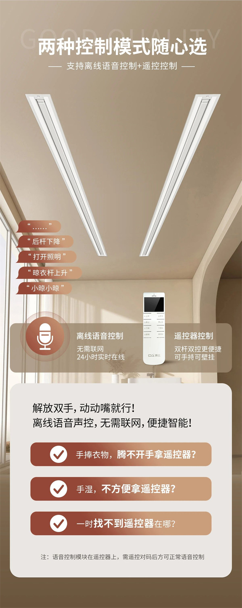 离线语音控制,无需联网,24小时实时在线,只需轻呼“小晾小晾”,说出自己的需求,“小晾”同学就能秒懂,人性化智能设计,动动嘴实现轻松晾衣。