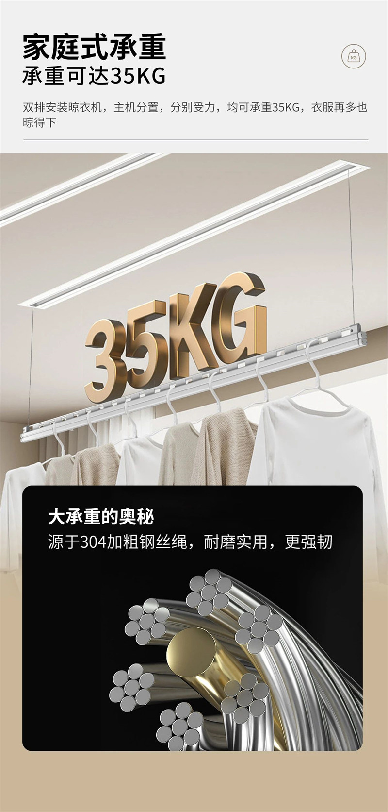 NO,NO,NO!完全不用担心。本款隐形智能语音晾衣机采用304加粗钢丝绳,耐磨强韧,每根晾衣杆均可承重35kg,完全满足家庭晾衣需求,衣服再多也不怕。