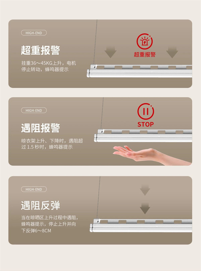 说了这么多,大家最在意的安全问题当然不能少,超重报警、遇阻反弹,保护人和机器,避免磕碰,让晾晒更安全。