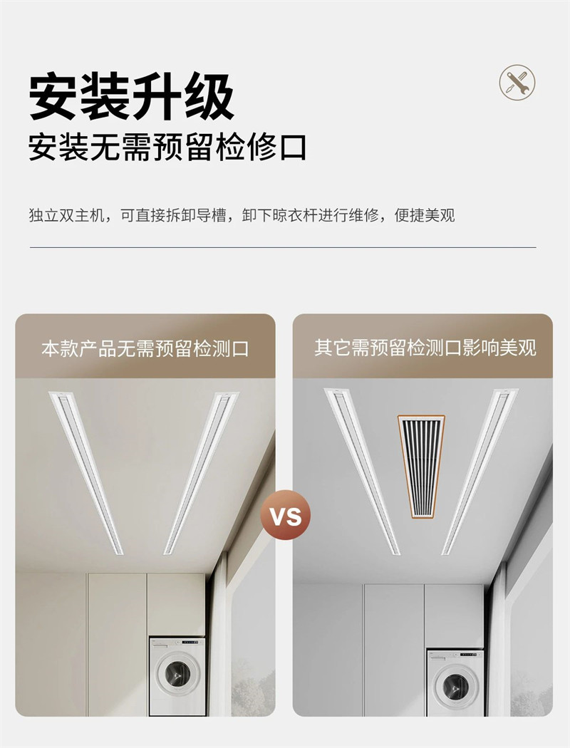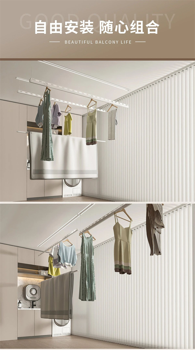 安装无需预留检修口,让空间更美观,让检修更便捷。此外,这款隐形智能语音晾衣机还能根据空间进行随意组装,让空间利用更高效,多方位晾晒配置,随心组合满足更多人群需求,小众户型也不怕,让生活充满无限可能。