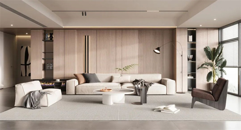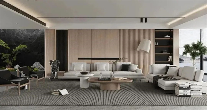 暖色调的木纹墙面常常被运用于小居室,打造温馨舒适的空间氛围,如果你家的面积足够大,则可以通过深色木纹,来塑造大气隐奢的高级质感。