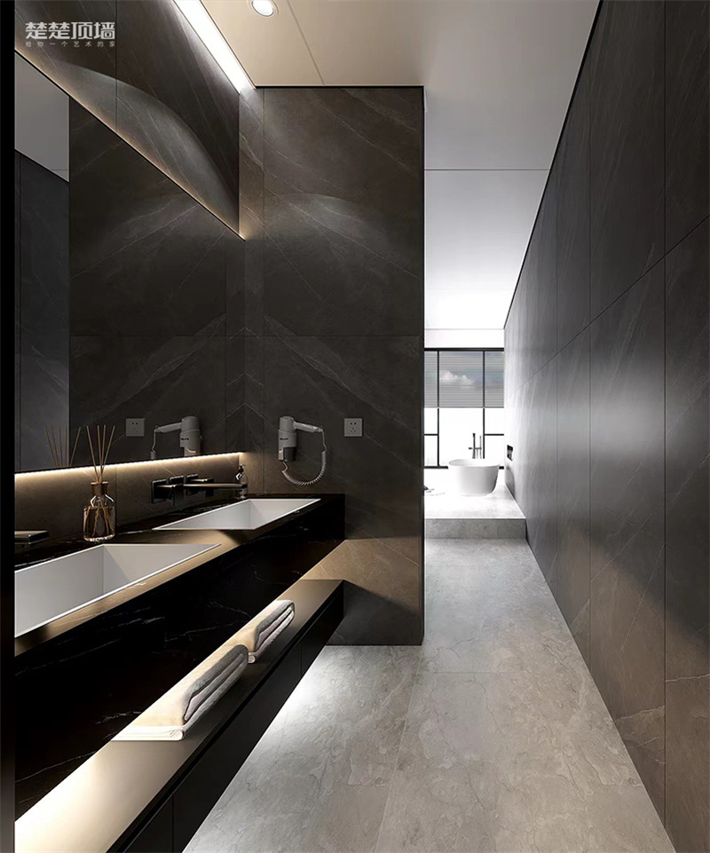 卫生间整体是暗黑色调,采用深灰色大理石铺贴,纹理自然细腻,深邃又有神秘感,耐脏又耐看,整个空间高级感满满。