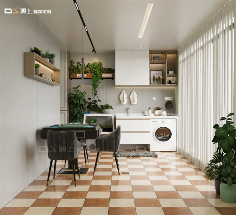 兼具休闲和实用功能,一面墙定制顶上家务柜,放置洗衣机、扫地机和常用物品。一面墙定制收纳柜,上部空间摆放咖啡机、饮水机,下部收纳零食茶叶等。